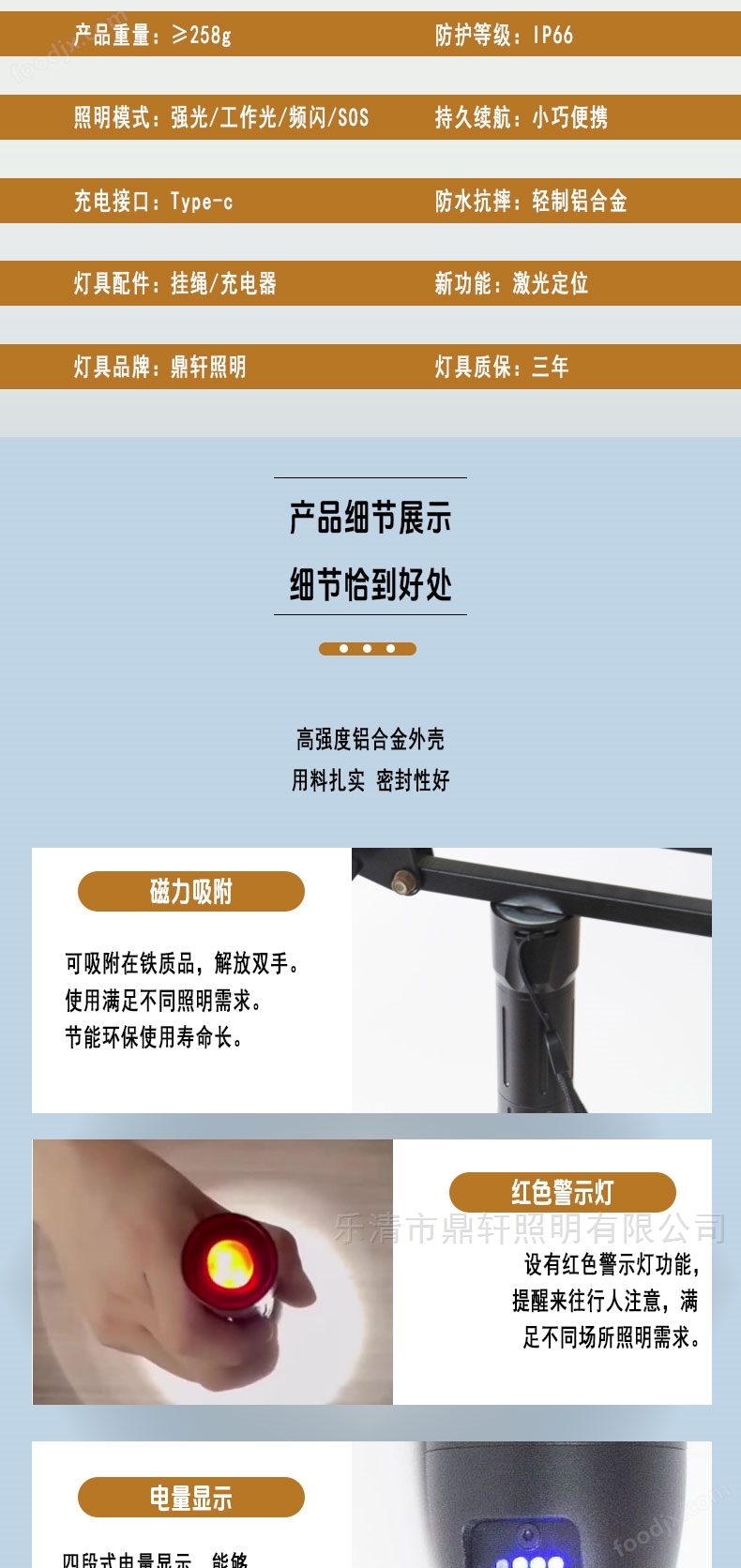 當前位置:樂清市鼎軒照明有限公司>>手電筒>> JW7625多功能LED手電筒5W電量顯示TYPE-C充電磁吸